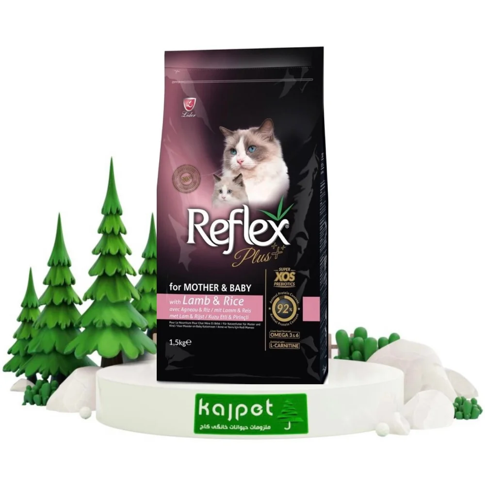 غذاخشک گربه مادراندبیبی رفلکس پلاس با طعم گوشت بره و برنج در بسته بندی 1.5 کیلوگرمی و 15 کیلوگرمی برای بچه گربه ، مادر شیرده و مادر باردار عرضه می شود.