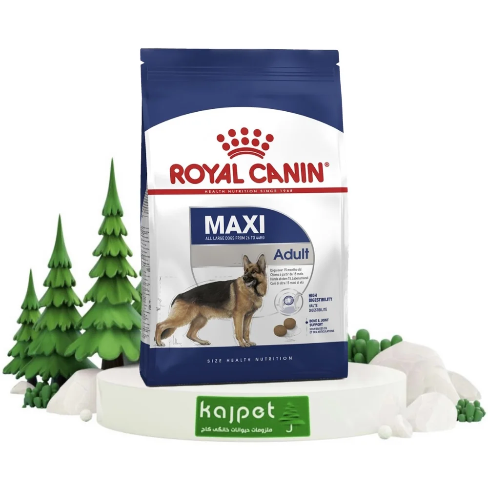 غذای خشک مکسی ادالت رویال کنین در بسته بندی 4 کیلوگرمی، 10 کیلوگرمی و 15 کیلوگرمی برای سگ های بالغ با نژاد بزرگ عرضه می شود.